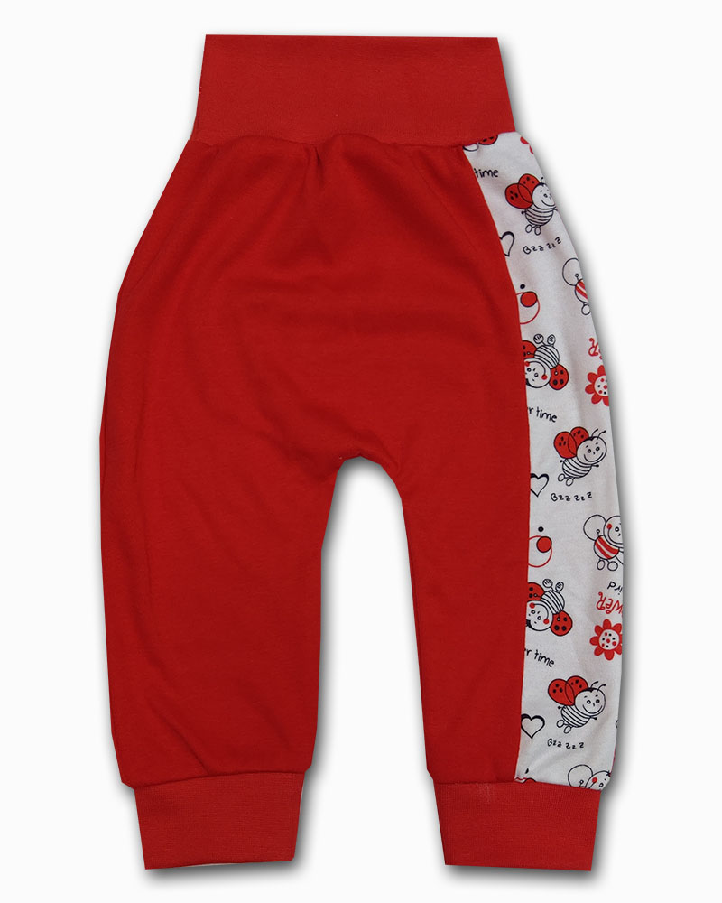 bavlněné tepláčky s lampasem s obrázky berušek, široký pohodlný pružný pas, který netlačí na citlivé bříško miminka, nohavičky ukončené pružným úpletem.