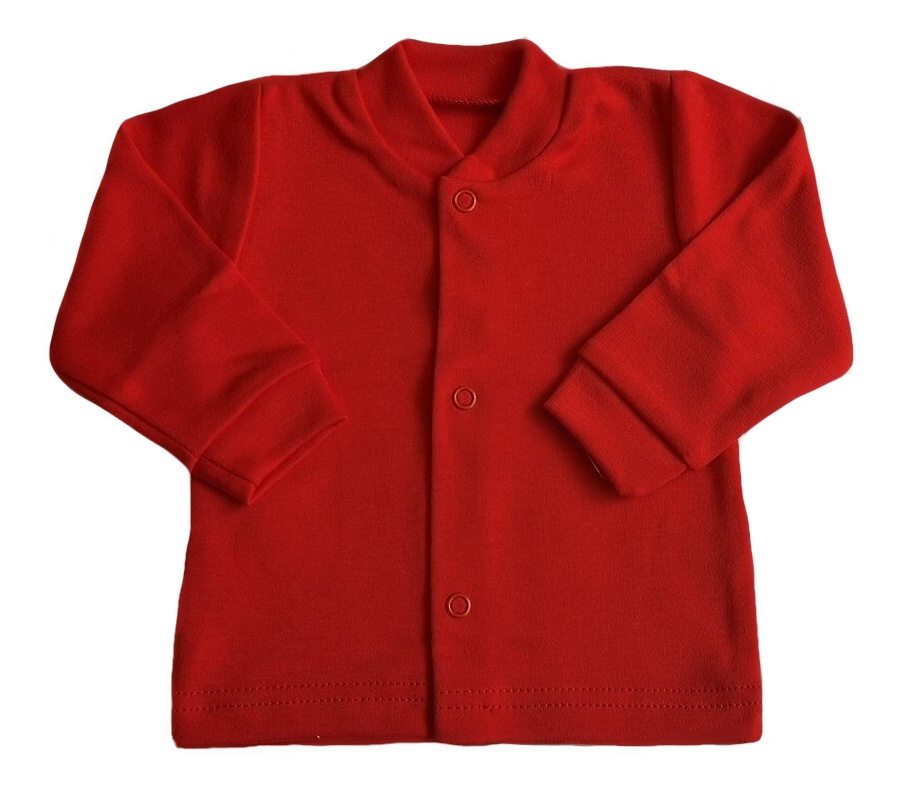 jemná příjemná bavlna v červené barvě, zapínání kabátku po celé délce uprostřed na baby druky.