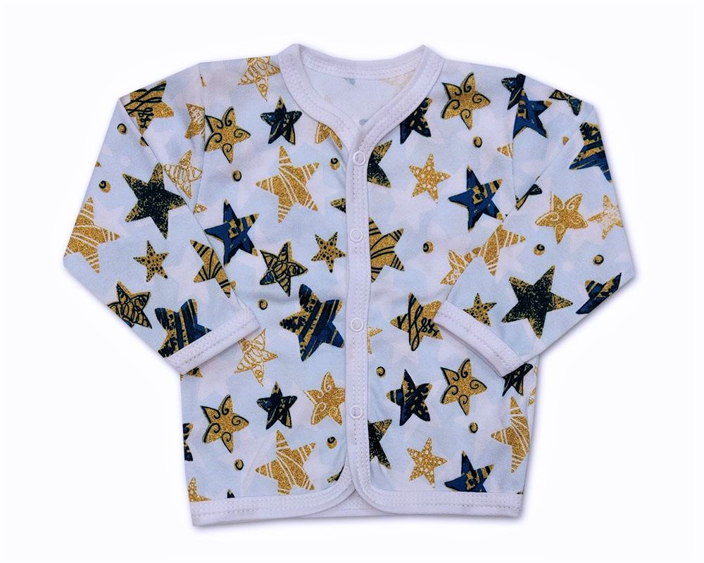 kabátek je ideální pro nejmenší miminka, vyroben ze super jemné kvalitní bavlny, která nedráždí pokožku dítěte. Praktické zapínání na baby druky po celé délce uprostřed. Vzor modré a zlaté hvězdy, bílé lemování.