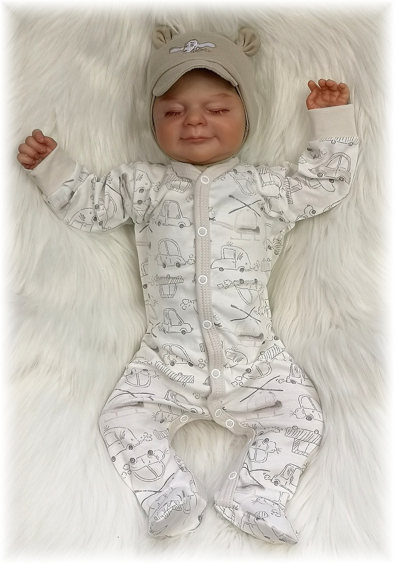 overálek je vyroben z příjemné jemné bavlny ideální pro miminka, zapínání uprostřed na baby druky - usnadňuje pohodlné oblékání i přebalování novorozených miminek - není nutné přetahovat přes hlavičku. Overal zdobí obrázky autíček, lemování v barvě krémové.