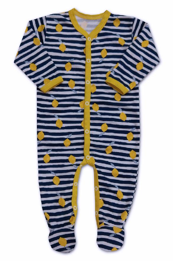 pruhovaný overálek je vyroben z příjemné jemné bavlny s obrázky citrónků, žluté lemování, zapínání uprostřed i mezi nožičkami na baby druky - usnadňuje pohodlné oblékání i přebalování novorozených miminek - není nutné přetahovat přes hlavičku.