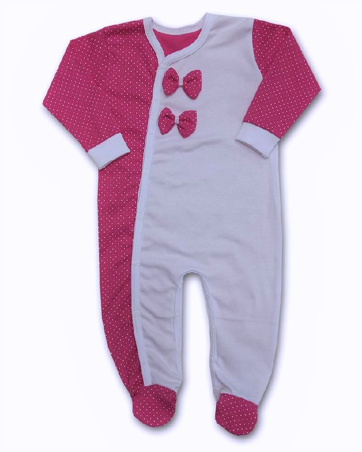 overálek je vyroben z příjemné jemné bavlny zdobený mašličkami, se vzorem bílých putíků na amarant podkladu, bílé lemování. Zapínání overalu po celé délce na boku i mezi nožičkami na baby druky - usnadňuje pohodlné oblékání i přebalování novorozených miminek - není nutné přetahovat přes hlavičku.