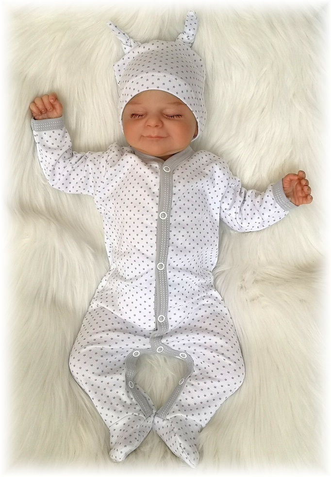 overálek je vyroben z příjemné jemné bavlny na bílém podkladu šedé hvězdy, šedé lemování, zapínání uprostřed i mezi nožičkami na baby druky - usnadňuje pohodlné oblékání i přebalování novorozených miminek - není nutné přetahovat přes hlavičku.