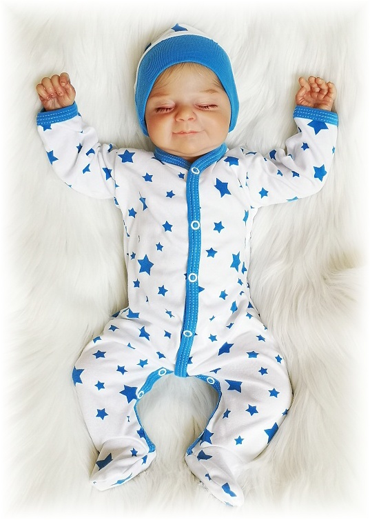 overálek je vyroben z příjemné jemné bavlny se vzorem hvězdiček, modré lemování, zapínání uprostřed i mezi nožičkami na baby druky - usnadňuje pohodlné oblékání i přebalování novorozených miminek - není nutné přetahovat přes hlavičku. Neobsahuje čepičku.
