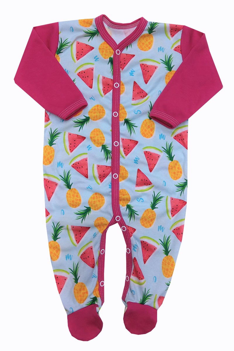 overálek je vyroben z příjemné super jemné bavlny s letním motivem, rukávky a lemování v barvě amarant , zapínání uprostřed i mezi nožičkami na baby druky - usnadňuje pohodlné oblékání i přebalování novorozených miminek - není nutné přetahovat přes hlavičku.