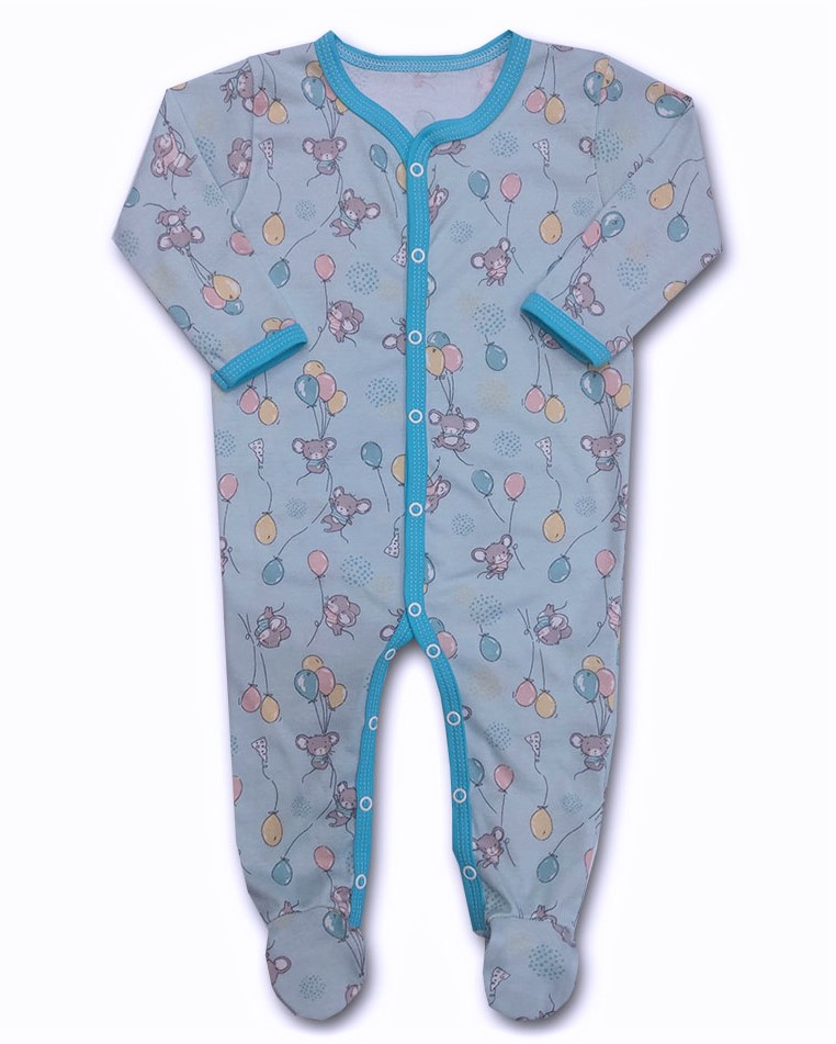overálek je vyroben z příjemné jemné bavlny s obrázky myšky s balónky, tyrkysové lemování, zapínání uprostřed i mezi nožičkami na baby druky - usnadňuje pohodlné oblékání i přebalování novorozených miminek - není nutné přetahovat přes hlavičku.