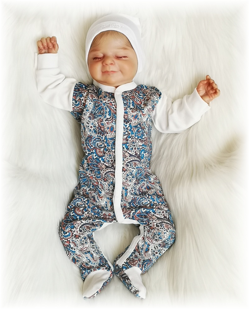 overálek je vyroben z příjemné bavlny se zajímavým vzorem, rukávky a lemování smetanové, zapínání uprostřed i mezi nožičkami na baby druky - usnadňuje pohodlné oblékání i přebalování novorozených miminek - není nutné přetahovat přes hlavičku.