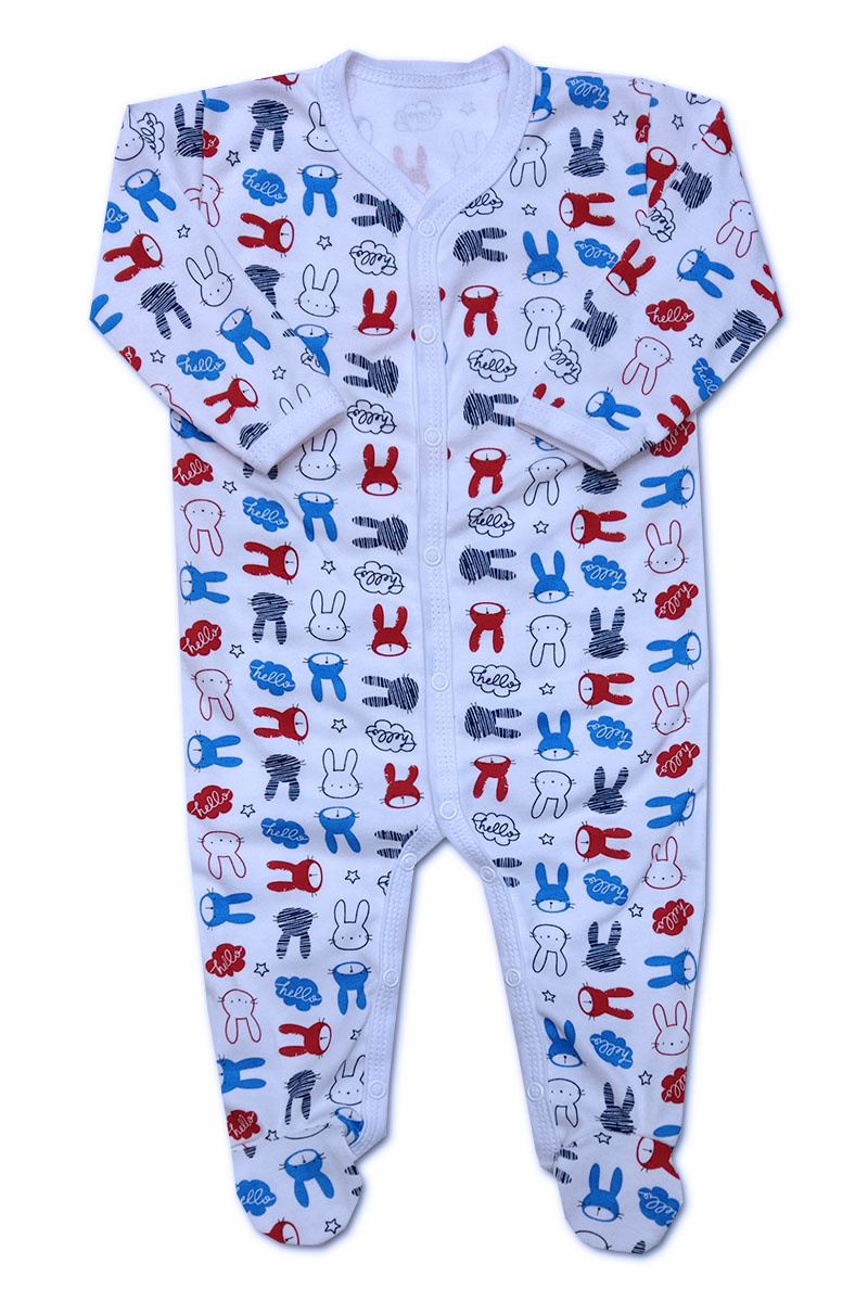 overálek je vyroben z příjemné jemné bavlny s obrázky hlaviček zajíčků, bílé lemování, zapínání uprostřed i mezi nožičkami na baby druky - usnadňuje pohodlné oblékání i přebalování novorozených miminek - není nutné přetahovat přes hlavičku.