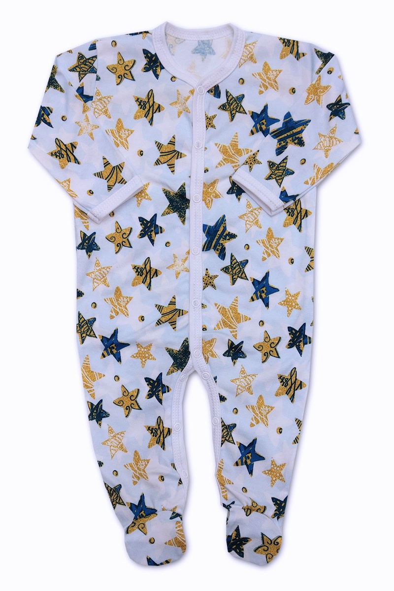 overálek je vyroben z příjemné super jemné bavlny s modrými a zlatými hvězdičkami, bílé lemování, zapínání uprostřed i mezi nožičkami na baby druky - usnadňuje pohodlné oblékání i přebalování novorozených miminek - není nutné přetahovat přes hlavičku.