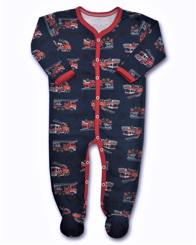 overálek je vyroben z příjemné jemné bavlny s obrázky požárních aut, červené lemování, zapínání uprostřed i mezi nožičkami na baby druky - usnadňuje pohodlné oblékání i přebalování novorozených miminek - není nutné přetahovat přes hlavičku.