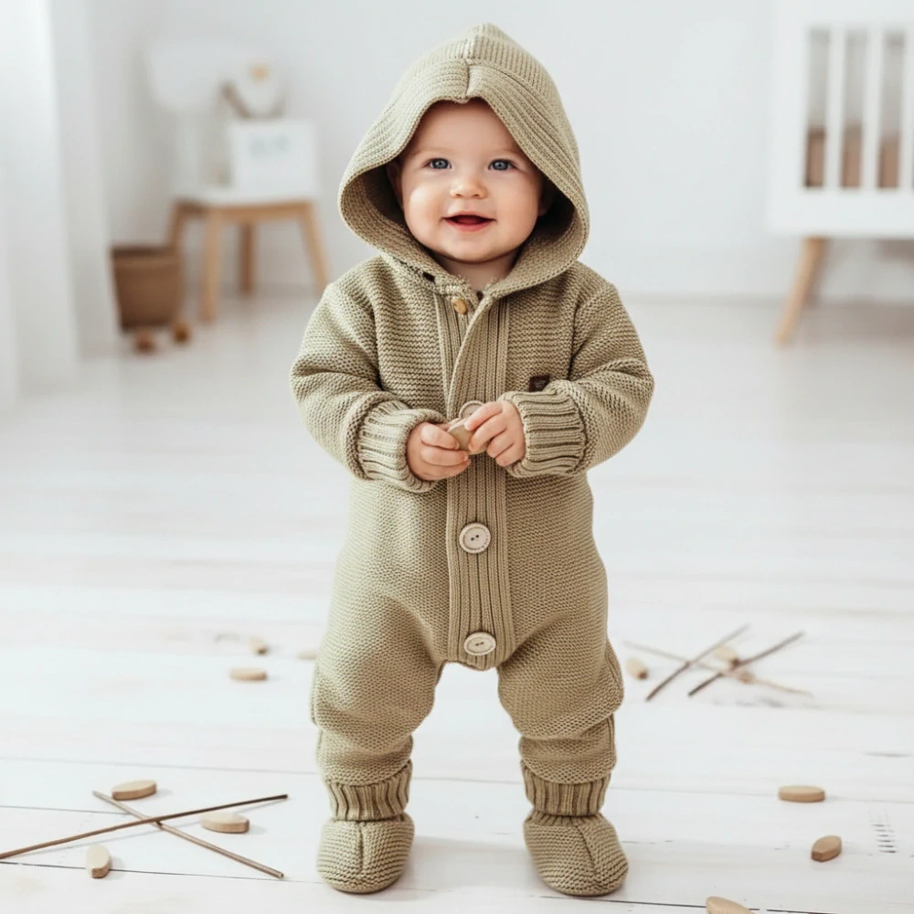 pružný, hřejivý, s kapuckou, zapínání uprostřed na baby druky-kryté efektními velkými knoflíky. Rukávky a nohavičky ukončeny pružnými ohrnovacími manžetami,dle potřeby omužňují prodloužení nohaviček i rukávků. Capáčky krásně drží na nožičce.