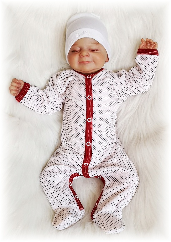 overálek je vyroben ze super jemného sametu s puntíčky, bordó lemování, zapínání uprostřed i mezi nožičkami na baby druky - usnadňuje pohodlné oblékání i přebalování novorozených miminek - není nutné přetahovat přes hlavičku.