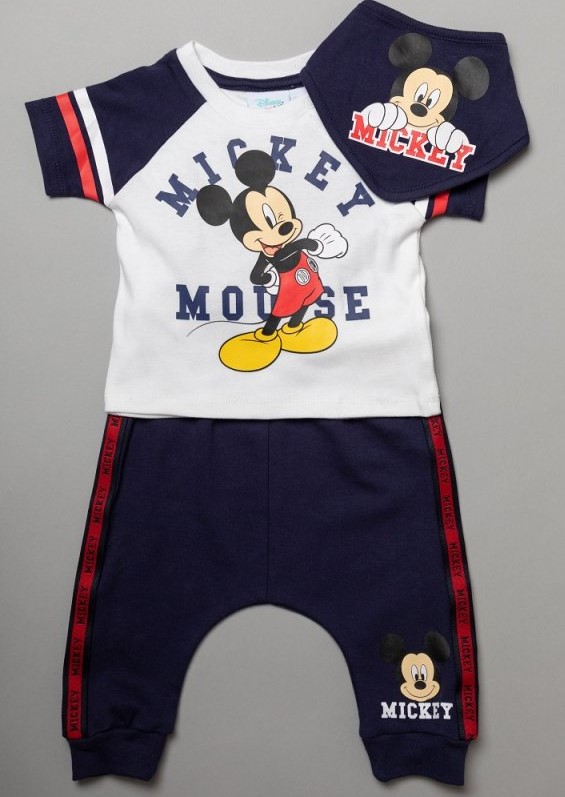 tričko s krátkým rukávkem a obrázkem Mickey, pro pohodlné oblékání přes hlavičku lodičkový výstřih, mezi nožičkami zapínání na baby druky, tepláčky s lampasem s obrázkem Mickey,doplňuje nákrčník-bryndáček s obrázkem .