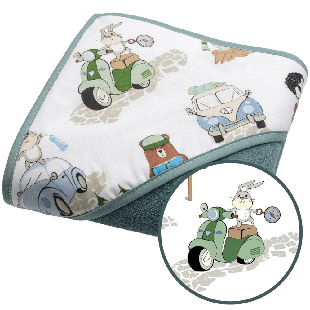 osuška pro miminka má na kapucce - obrázky zvířátek v autě, celá osuška obšitá.