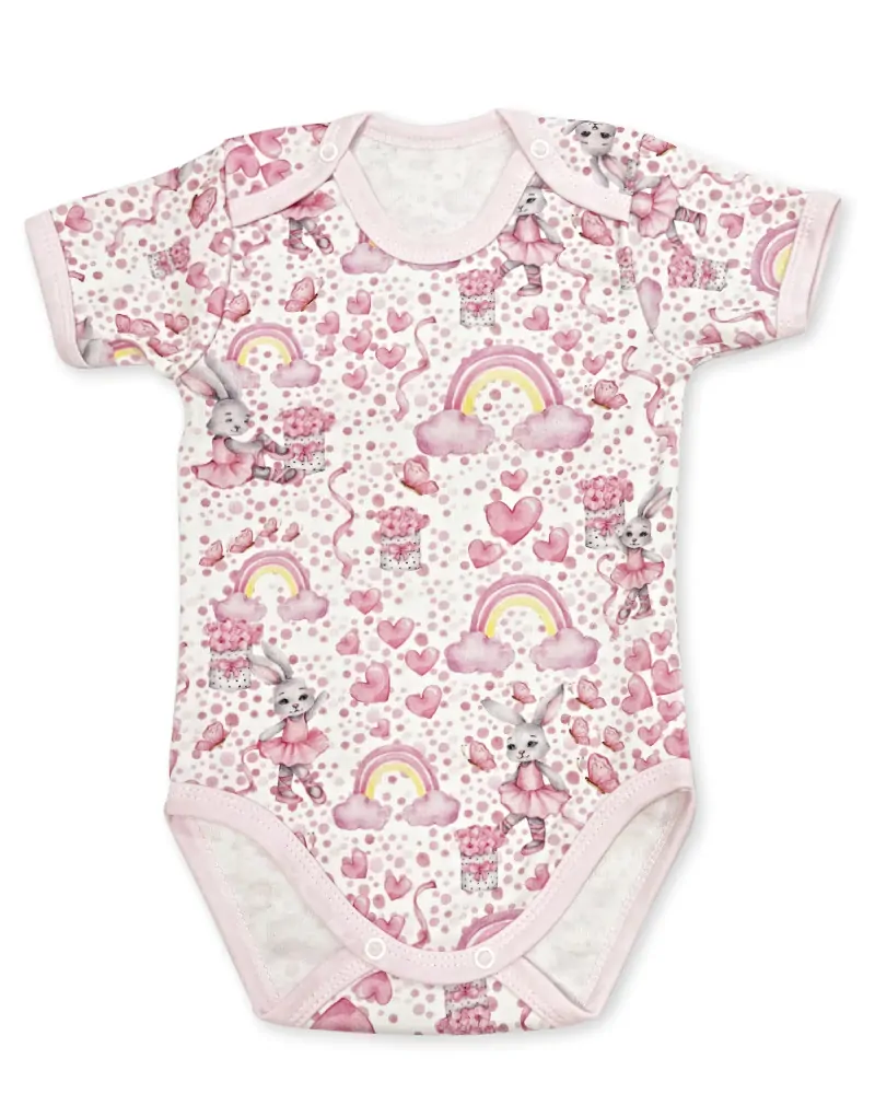body z příjemné bavlny s obrázky baletky zajíčka, zapínání na obou ramínkách a mezi nožičkami na baby druky, pohodlné oblékání přes hlavičku i přebalování miminka.