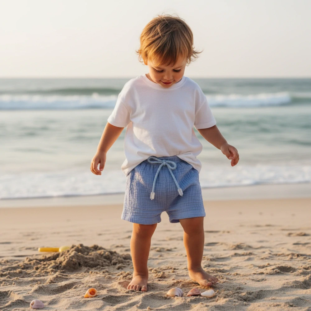 - Dětské mušelínové kraťasy modrá 98