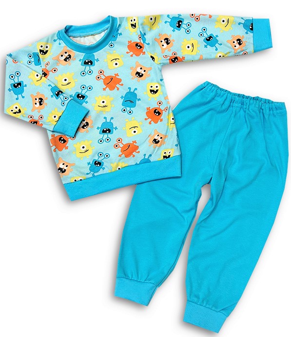 Pyžamo pro děti tvoří pyžamové tričko s dlouhým rukávem a dlouhé pyžamové kalhoty. Pyžamové tričko zdobí obrázky strašidýlek, pyžamové kalhoty v tyrkysové barvě, rukávky i lem u krku ukončeny elastickými lemy, kalhoty mají pružný pas, nohavičky ukončeny elastickými lemy.