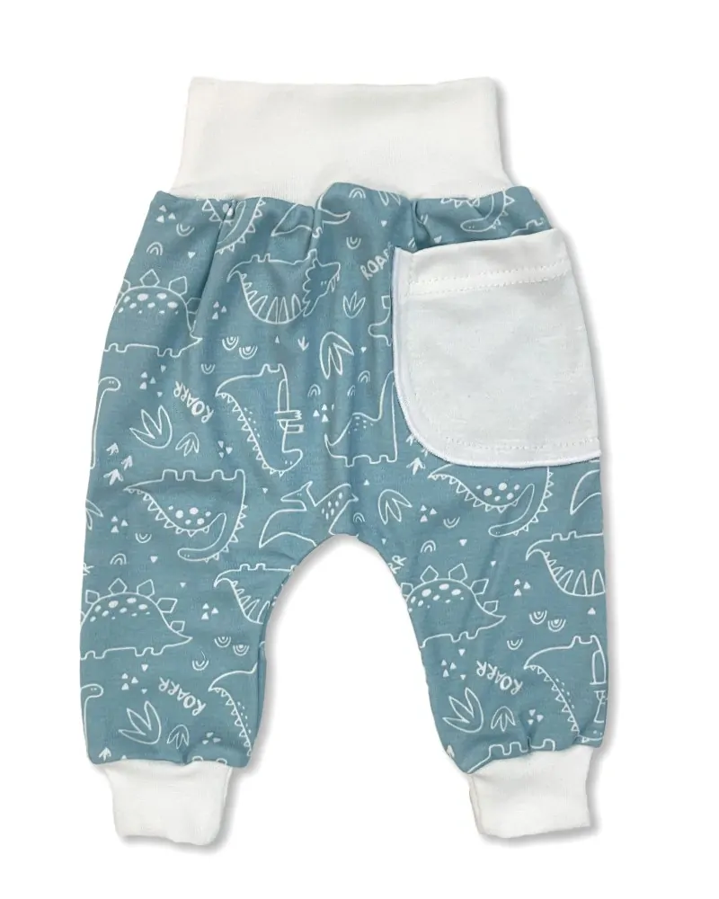 tepláčky s kapsičkou jsou vyrobené z příjemné jemné bavlny v mátové barvě v kombinaci bílá - potisk dinosaurů, pohodlný pružný pas netlačí na citlivé bříško miminka, ukončení tepláčků pružnou manžetou.