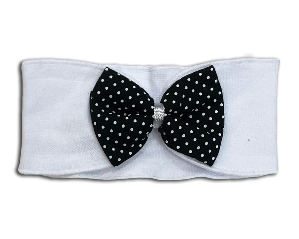 široká pružná čelenka s mašličkou z Černé puntíky. Čelenka krásně překryje ouška, za větrného počasí udělá parádu i ochrání ouška.