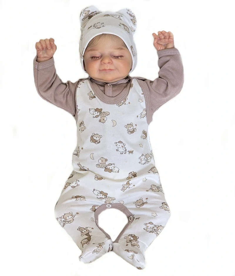 soupravička obsahuje 1x dupačky s jemným potiskem medvídků, vyrobené z kvalitní jemné bavlny, zapínání na ramínkách a mezi nožičkami na baby druky - usnadňuje pohodlné oblékání i přebalování novorozených miminek. 1x jednobarevný kabátek je ideální pro nejmenší miminka, praktické zapínání na baby druky po celé délce uprostřed. Bez čepičky.