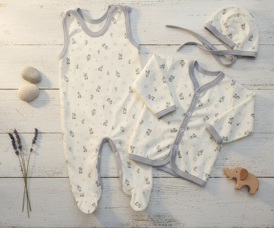 soupravička obsahuje 1x dupačky vyrobené z kvalitní jemné bavlny , zapínání na ramínkách a mezi nožičkami na baby druky - usnadňuje pohodlné oblékání i přebalování novorozených miminek. 1x kabátek je ideální pro nejmenší miminka, praktické zapínání na baby druky po celé délce uprostřed.1x klasickou čepičku na zavazování. Celou soupravu zdobí potisk kačenek a hvězdiček, lemování šedé.