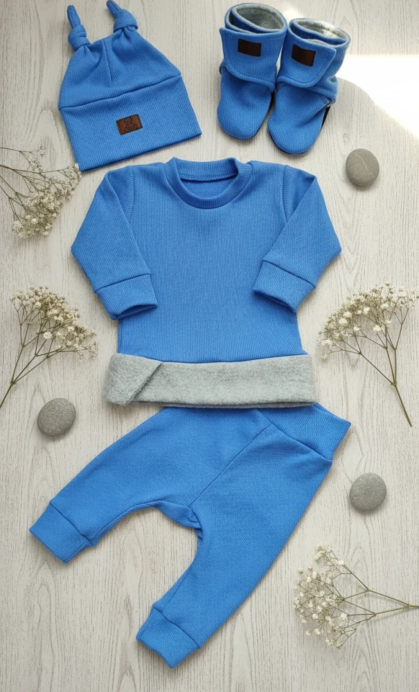 krásná 4 dílná souprava z pružného bavlněného materiálu obsahuje, mikinku, tepláčky, čepičku a vyteplené capáčky flecem se zapínáním na baby druk.