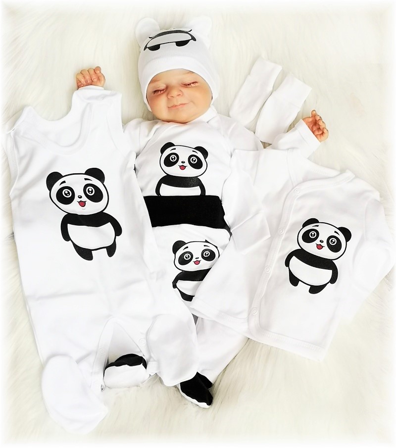 soupravička obsahuje šest dílů oblečků pro novorozence - bavlněný kabátek, zavinovací body, polodupačky, dupačky, čepičku s oušky + bílé bavlněné rukavičky ZDARMA. Celou soupravu vhodné do porodnice zdobí obrázek roztomilé pandy.