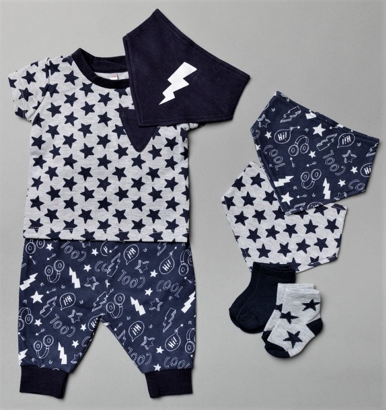soupravička obsahuje, bavlněné tričko s dlouhým rukávkem, tepláčky, 3x šátek na krk(bryndáček), 2x ponožky.