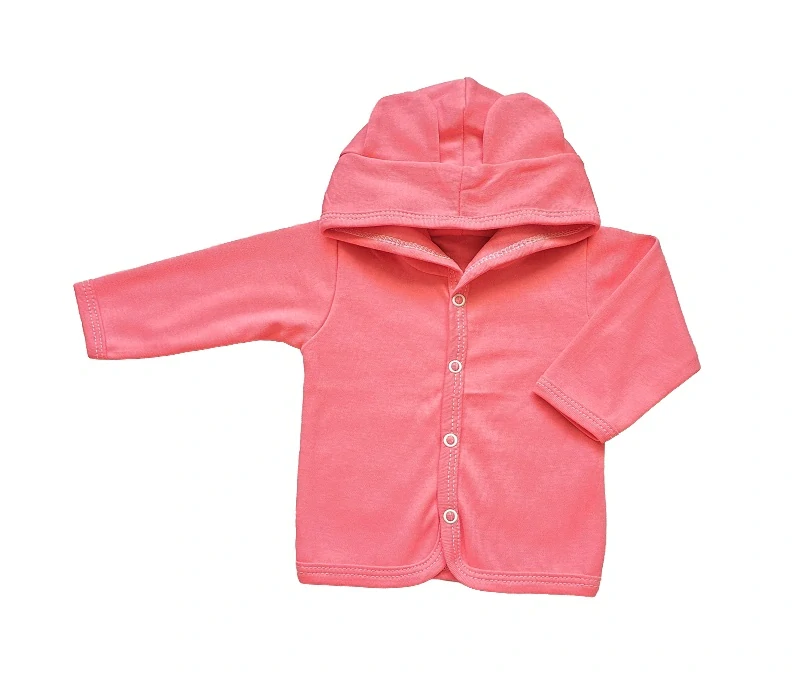 mikinka je ideální pro nejmenší miminka, vyrobena z kvalitní bavlny, která nedráždí pokožku dítěte. Praktické zapínání na baby druky po celé délce uprostřed. Kapucka s roztomilými oušky z dvojité bavlny, dobře ochrání hlavičku miminka před chladem.