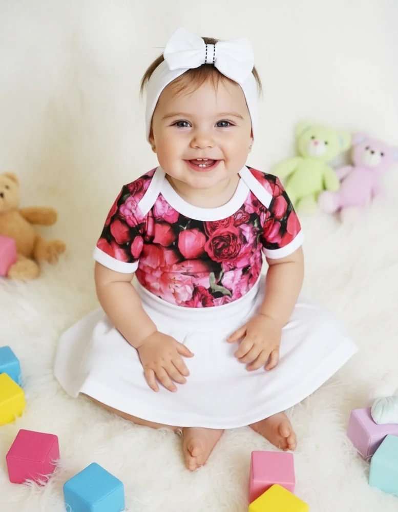 body s krátkým rukávkem s krásným digitálním potiskem růžiček,zapínání na ramínkach i mezi nožičkami na baby druky, dopňuje bílá sukýnka s pohodlným pružným pasem. čelenka není součástí - můžete dokoupit jednotlivě dle vlastního výběru .