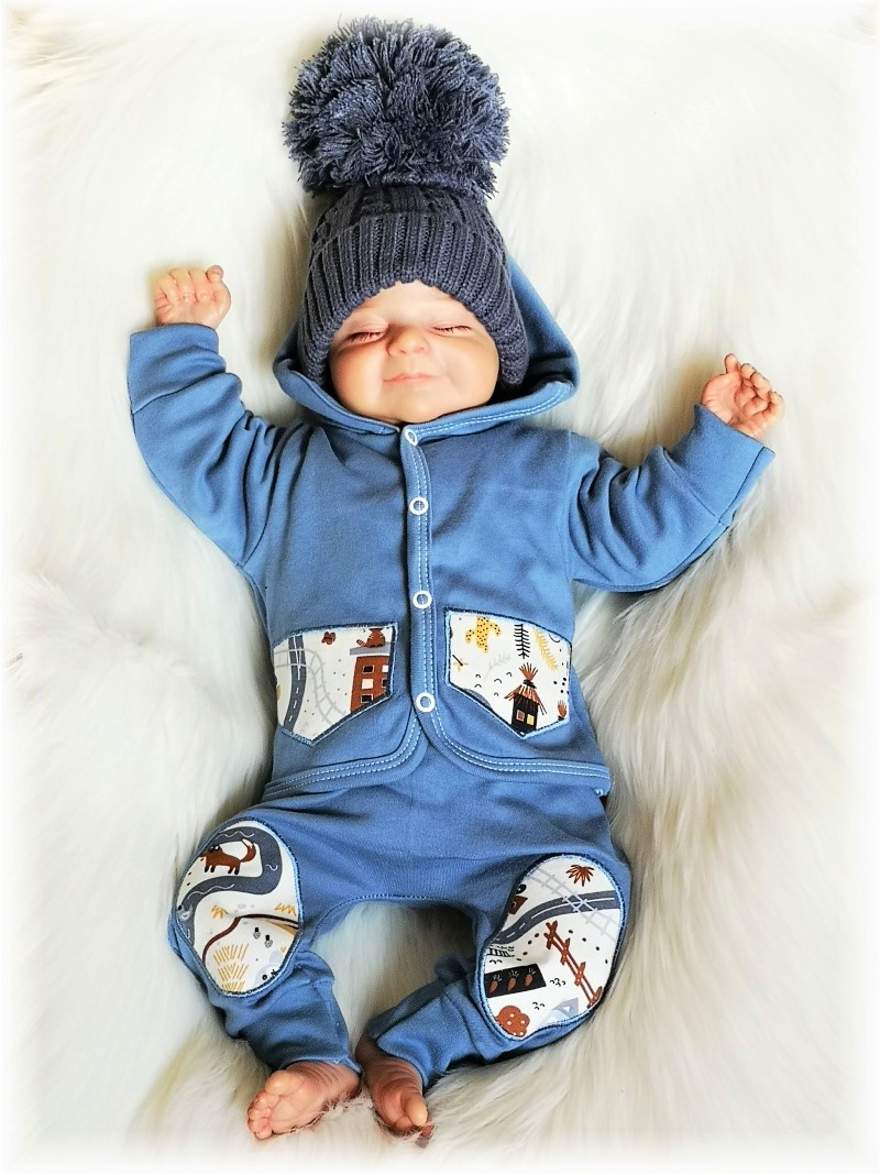 mikina pro miminka vyrobena z kvalitní bavlny, zapínání uprostřed na baby druky, rukávky ukončené pružným nápletem. Vrchní část jednobarevná policejní modrá bavlna , podšívka s potiskem obrázků. Krásně doplňuje kolekci Happy trip.