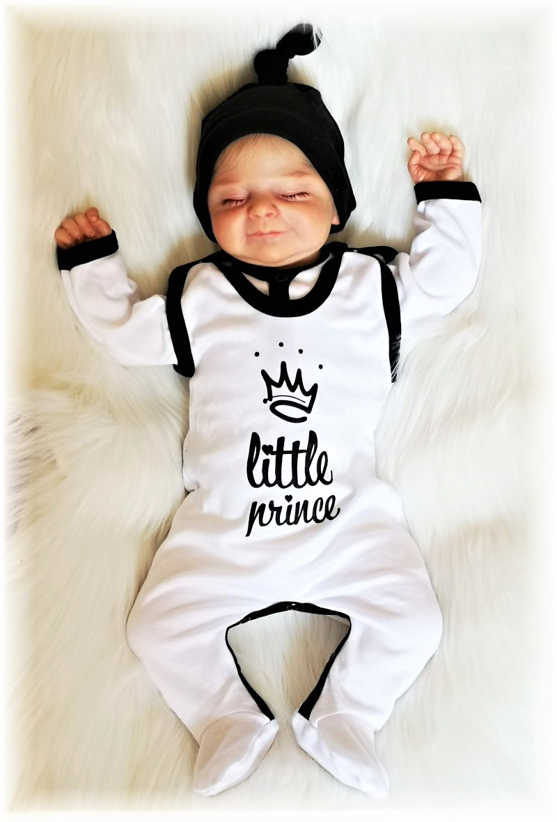 bavlněný kabátek se zapínáním uprostřed na baby druky s černým lemováním, dupačky s nápisem LITTLE PRINCE, zapínání dupaček na ramínku i mezi nožičkami na baby druky ulehčují přebalování. Čepička není součástí soupravy.