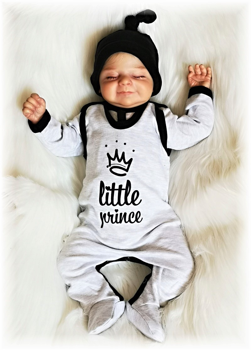 bavlněný kabátek se zapínáním uprostřed na baby druky s černým lemováním, dupačky s nápisem LITTLE PRINCE, zapínání dupaček na ramínku i mezi nožičkami na baby druky ulehčují přebalování. Čepička není součástí soupravy.