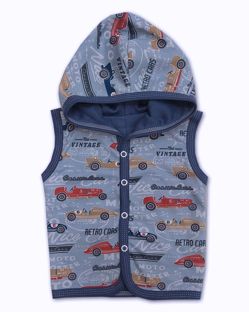 jemný bavlněný materiál s obrázky retro autíček podšitý bavlnou v barvě denim, zapínání vestičky uprostřed na baby druky.