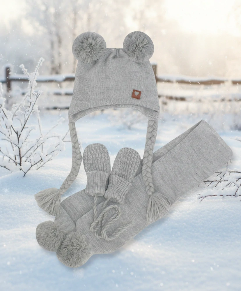 - Kojenecká zimní čepička, šála a rukavičky šedá