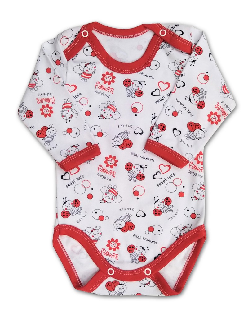 body z příjemné bavlny s obrázky berušek s červeným lemováním, zapínání na obou ramínkách a mezi nožičkami na baby druky, pohodlné oblékání přes hlavičku i přebalování miminka.
