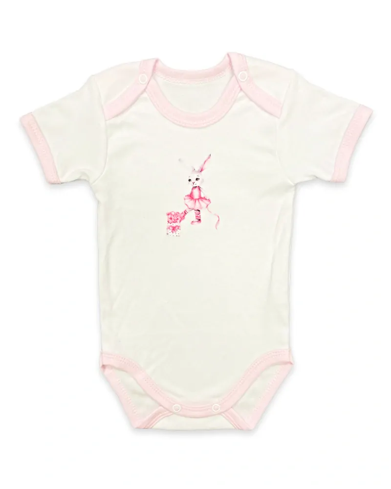 body z příjemné bavlny s obrázkem baletky zajíčka, zapínání na obou ramínkách a mezi nožičkami na baby druky, pohodlné oblékání přes hlavičku i přebalování miminka.