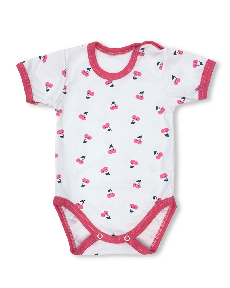 body z příjemné bavlny s obrázky třešniček , zapínání na ramínku a mezi nožičkami na baby druky, pohodlné oblékání přes hlavičku i přebalování miminka.