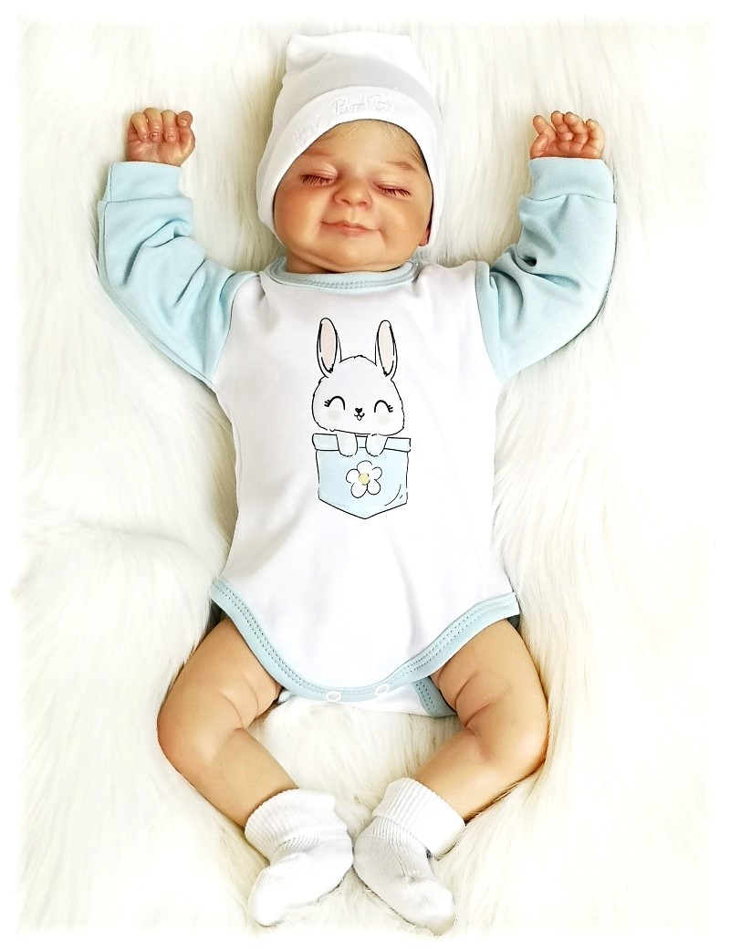 body z příjemné kvalitní bavlny a krásným obrázkem králíčka, má na ramínku i mezi nožičkami zapínání na baby druky. Lemování a rukávky v mintové barvě.