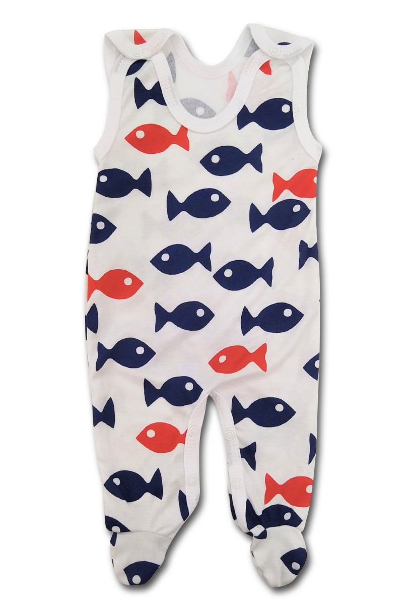 dupačky jsou vyrobené z kvalitní bavlny s obrázky modrých a červených rybiček, zapínání na ramínkách a mezi nožičkami na baby druky - usnadňuje pohodlné oblékání i přebalování novorozených miminek.