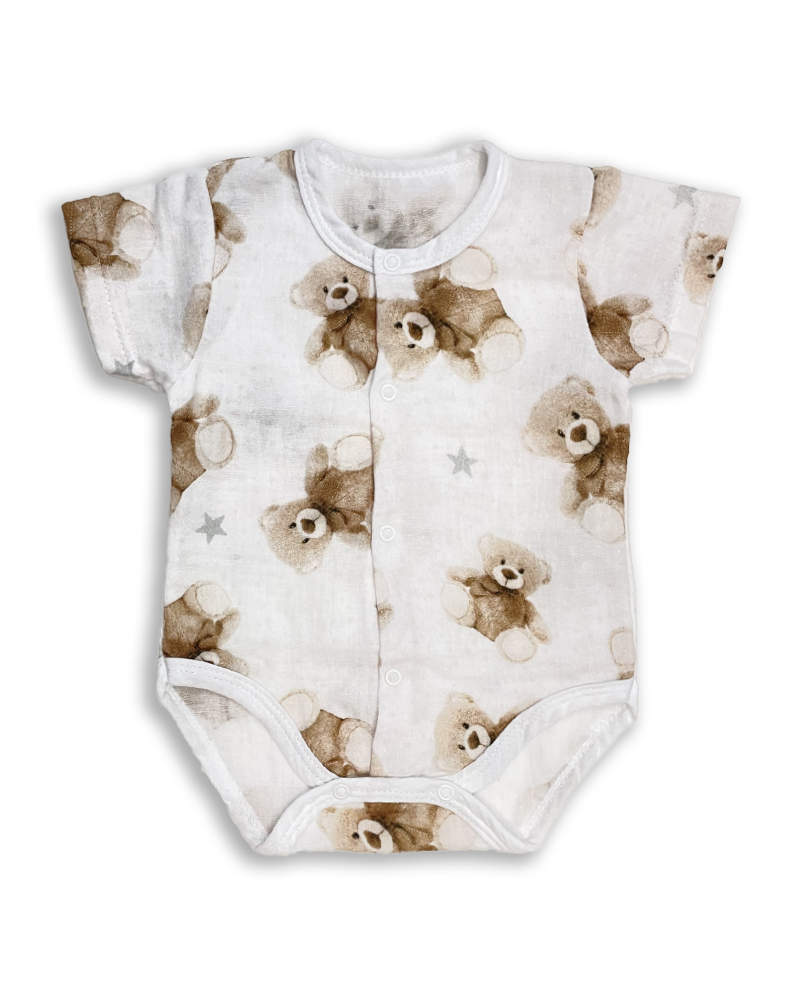 vzdušné bodynko pro miminko, zapínání po celé délce uprostřed na baby druky. Roztomilý vzor medvídků v kombinaci se smetanovou barvou. Vynikající materiál, kterého hlavní výhodou je jeho prodyšnost. Otevřená vazba tkaní a lehká struktura umožňuje mušelínu dýchat a zajišťuje dostatečnou cirkulaci vzduchu a tím snižuje riziko přehřátí. Ideální materiál pro oblečení pro děťátko na horké letní dny.