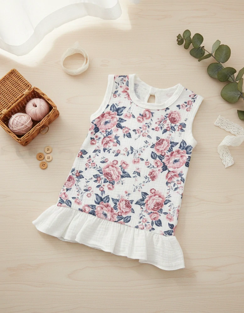 krásné vzdušné šaty pro miminko, zapínání vzadu na knoflíček. Krásný vzor růžiček v kombinaci se smetanovou barvou. Vynikající materiál, kterého hlavní výhodou je jeho prodyšnost. Otevřená vazba tkaní a lehká struktura umožňuje mušelínu dýchat a zajišťuje dostatečnou cirkulaci vzduchu a tím snižuje riziko přehřátí. Ideální materiál pro horké letní dny.