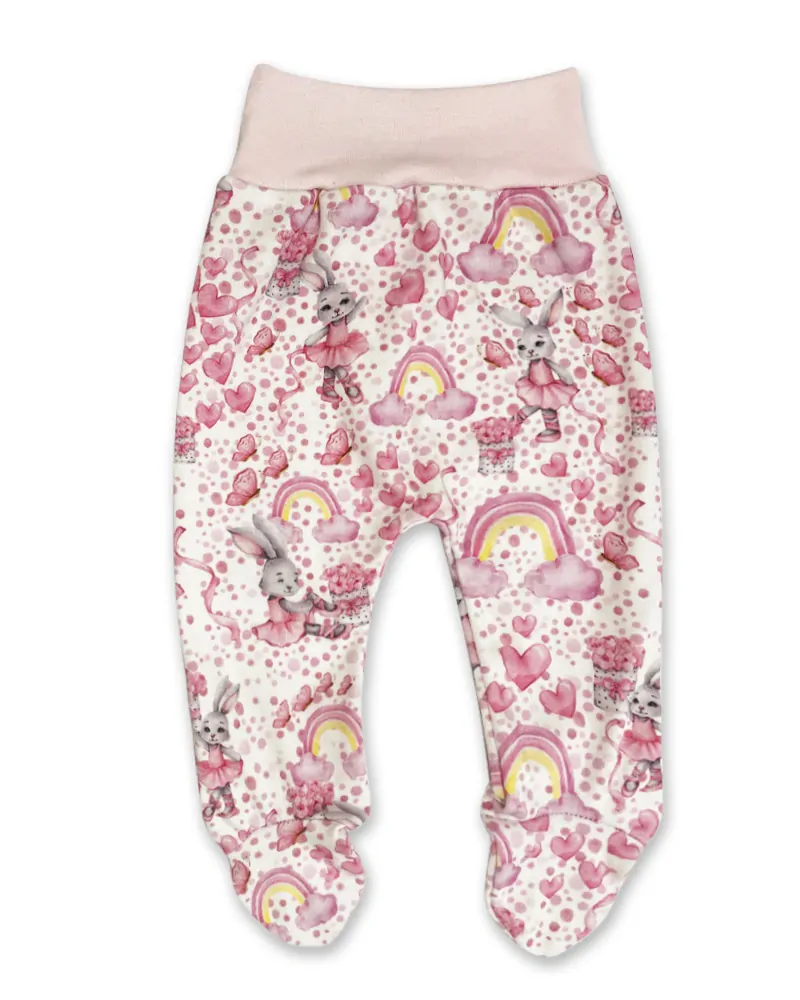 bavlněné polodupačky s obrázky baletek zajíčků, široký pohodlný pružný pas v růžové barvě , netlačí na bříško dítěte.