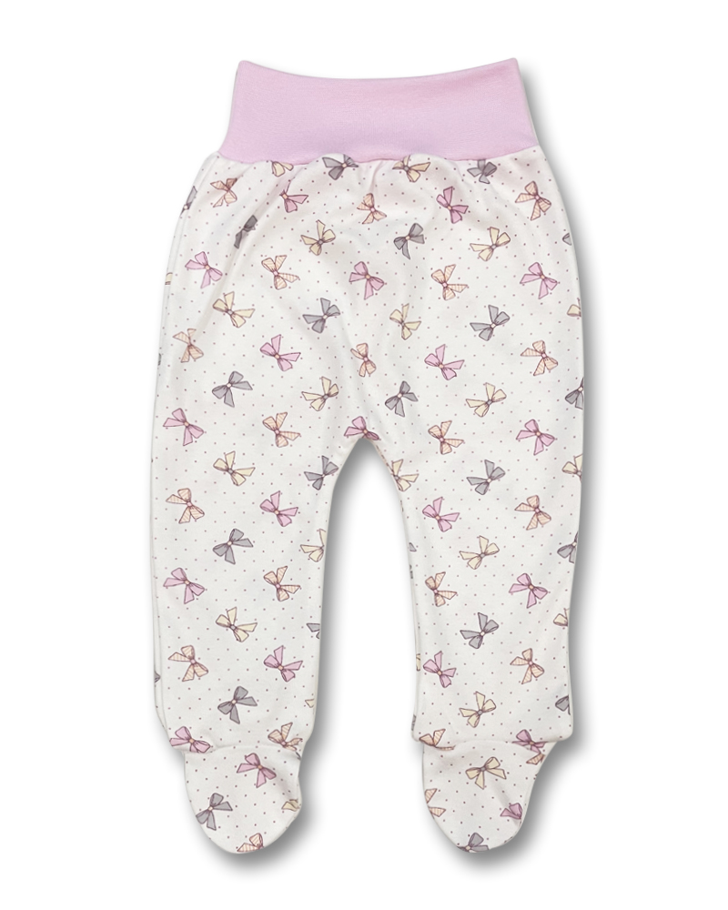 bavlněné polodupačky s obrázky barevných mašliček, široký pohodlný pružný pas v bílé barvě, netlačí na bříško dítěte.