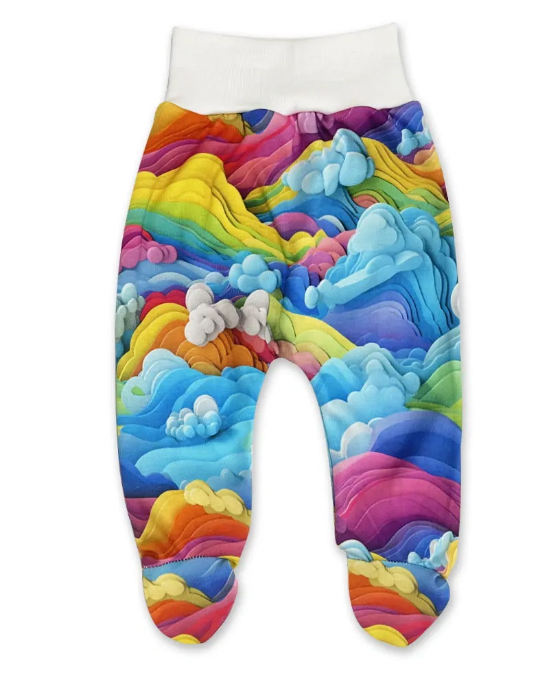 bavlněné polodupačky v duhových barvách, široký pohodlný pružný pas v bílé barvě , netlačí na bříško dítěte.