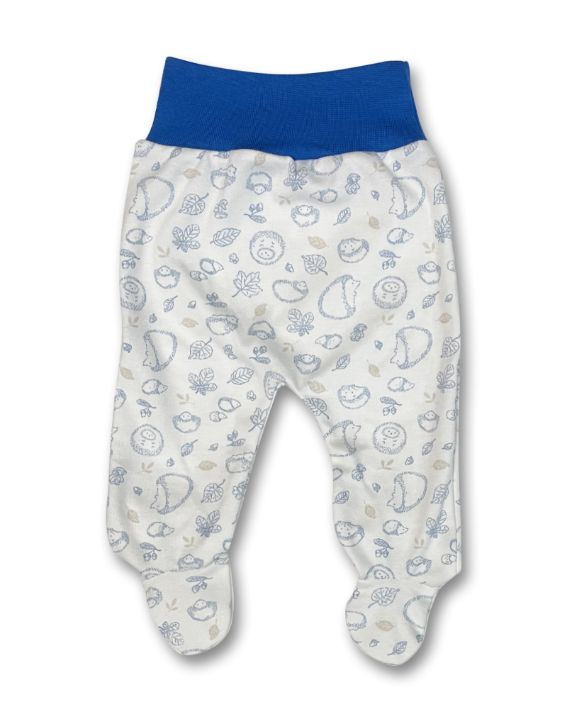 bavlněné polodupačky s obrázky ježečků , široký pohodlný pružný pas v barvě modré, netlačí na citlivé bříško miminka.