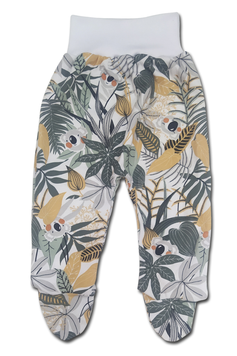 bavlněné polodupačky s obrázky medvídka koaly, široký pohodlný pružný pas v bílé barvě, netlačí na bříško dítěte.