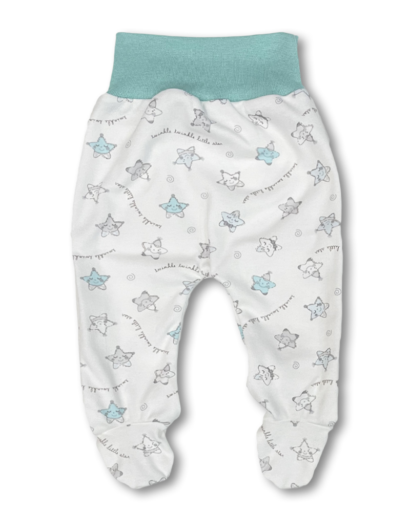 bavlněné polodupačky s obrázky roztomilých hvězdiček, široký pohodlný pružný pas v barvě máty, netlačí na bříško dítěte.