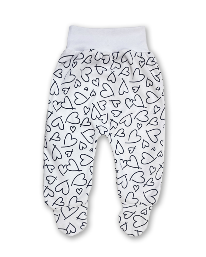 bavlněné polodupačky s obrázky černých srdíček na bílém podkladu, široký pohodlný pružný pas v bílé barvě.