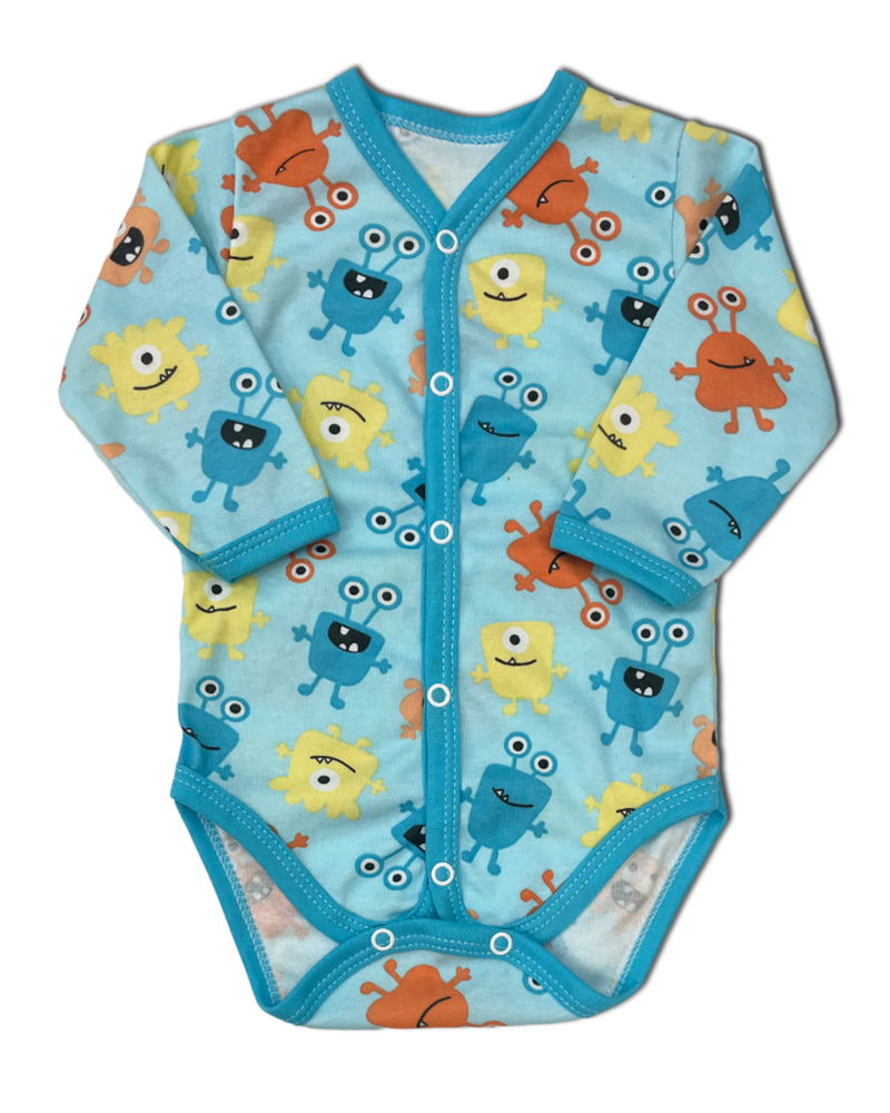 bobynko je vyrobené z příjemné jemné bavlny, zapínání uprostřed na baby druky - usnadňuje pohodlné oblékání i přebalování novorozených miminek - není nutné přetahovat přes hlavičku. Body s obrázky barevných strašidýlek.